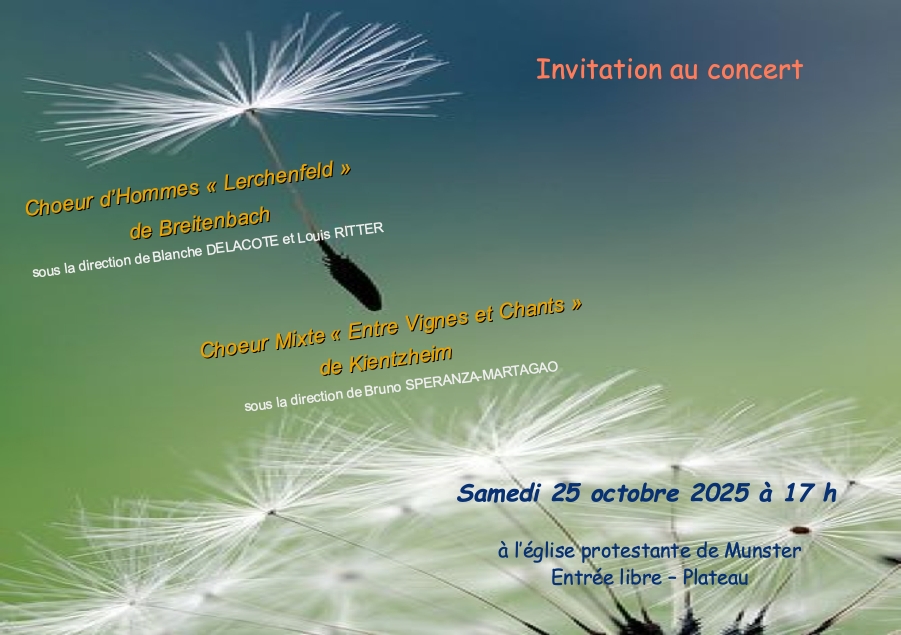 -samedi 25 octobre 2025 : concert partagé avec le Choeur d'Hommes "Lerchenfeld" de Breitenbach à l'église protestante de Munster